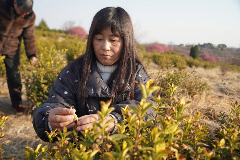 “三四月份来采茶,平时就来除除草,一年到头都可以在家门口挣钱。跟着发花干,日子越过越好。”吴国英是路店村村民,自茶园建设之初就在这里打工。